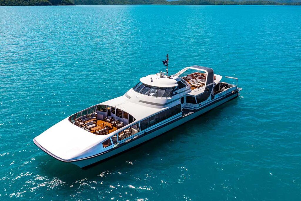 1️⃣ Whitehaven Beach Full Day – $229 – Spend 5 hours at Whitehaven Beach with unlimited boat-to-beach transfers aboard Super Flyer. Relax on the soft white silica sand, take a guided walk to South Whitehaven Lookout, and enjoy a buffet lunch onboard.